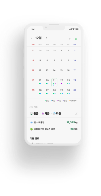 탄소달력은 단순히 탄소 배출량을 계산할 뿐 아니라 임직원의 근무와 그 날의 이동 경로를 기록합니다.