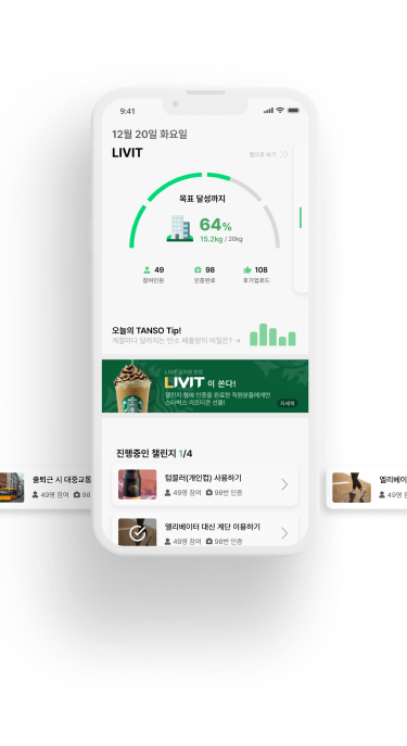 기업 내에서 발생하는 탄소배출량을 회사 임직원들 모두와 함께 매일 챌린지를 수행하여 소속감과 즐거움을 느낄 수 있습니다.